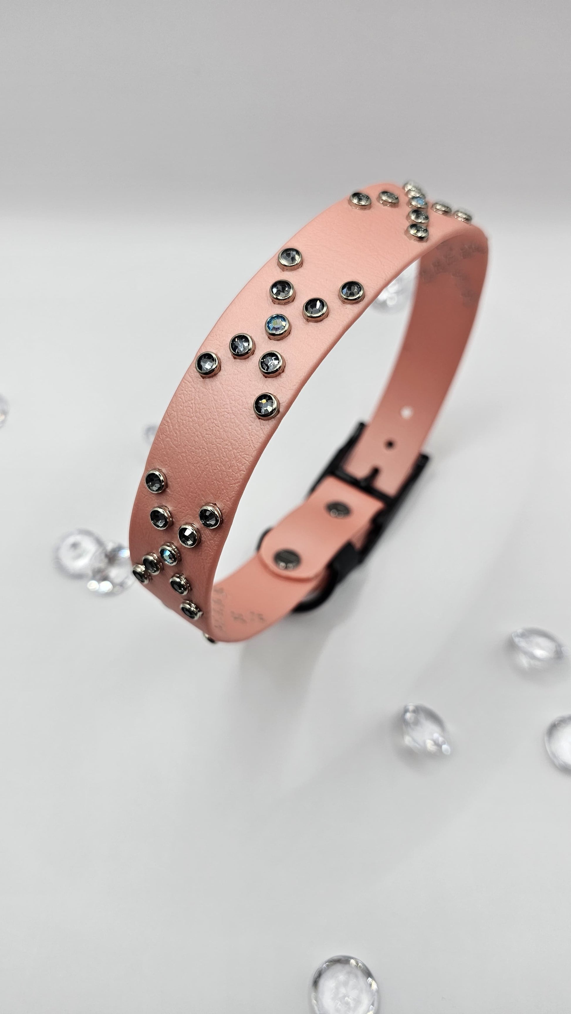 Upgrade every walk into a luxurious moment with our customised Biothane Crystal Cross Section Design collar. Crafted from rugged, waterproof Biothane and adorned with a cross shaped design of sparkling crystals, this collar blends durability with high-end fashion for a standout look.